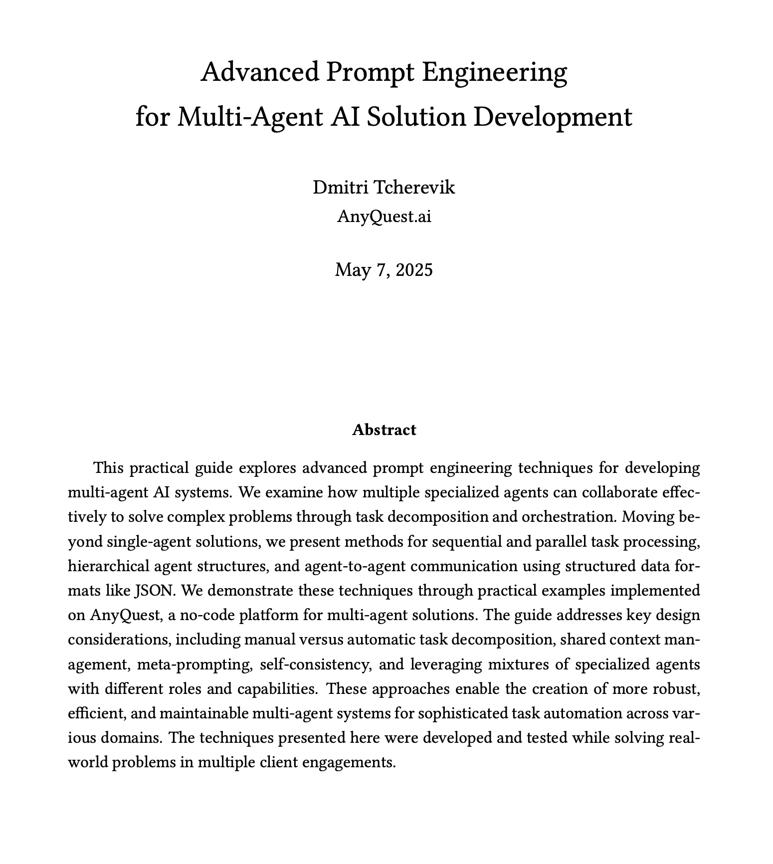 Our comprehensive guide, "Advanced Prompt Engineering for Multi-Agent AI Solution Development," presents cutting-edge techniques that enhance AI automation. Tested in real-world client engagements, this practical resource takes your prompt engineering skills to the next level.
