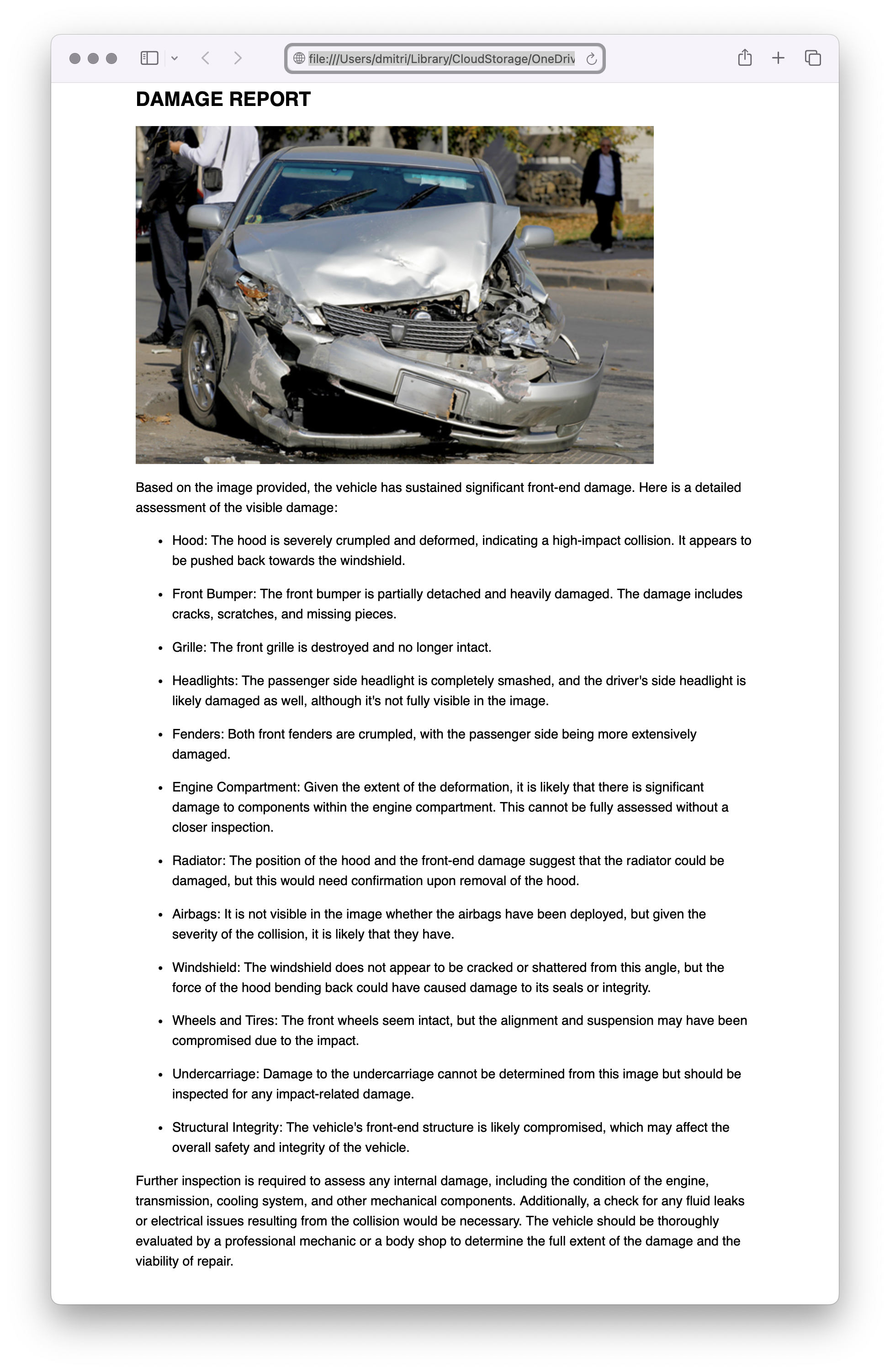 If we run this app on our car accident image, we get a rather detailed description of the damage that would make any insurance adjuster proud.