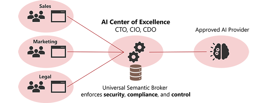 The semantic broker can be centrally managed by a Generative AI Center of Excellence, which can also be responsible for establishing best practices, processes, solution patterns, and personnel training, all the vital components of the business AI Quotient (AQ).