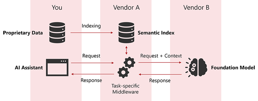 Vendor A hosts a semantic index for the proprietary data owned by the company. The index is used to enrich user requests with relevant data before they are forwarded to the large foundation model. Without proprietary data, the model’s responses would be useless: too generic and outdated.